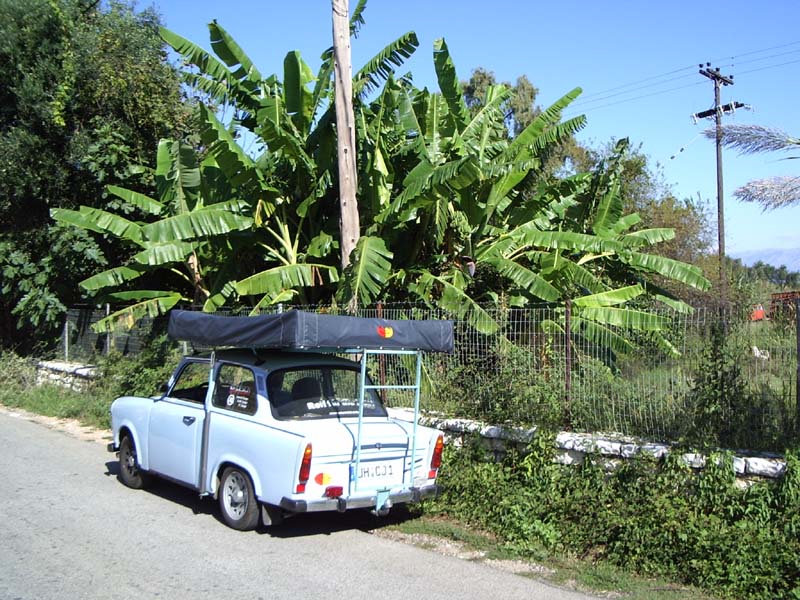 Chris601: das hatte ich auch noch nicht, mein Trabant unter einem tragendem (!) Bananenbaum. (rechts über dem dachzelt ist eine lila Blüte zu erkennen. Direkt darüber Bananen)
